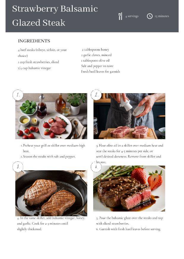 Enhance your main courses with our unique marinades, glazes, and sauces. Imagine a Strawberry Balsamic Chicken Marinade that infuses your grilled dishes with a sweet tang, or a Spicy Strawberry Glaze that adds a kick to your favorite meats. These recipes are designed to take your culinary creations to new heights.