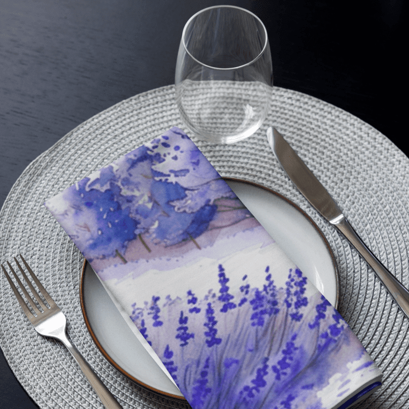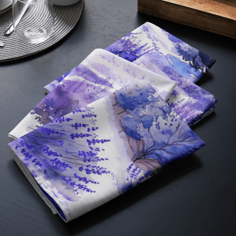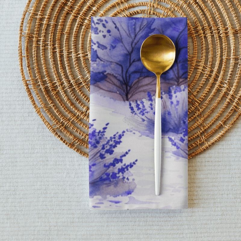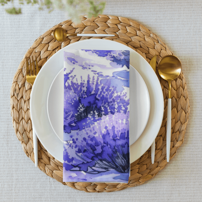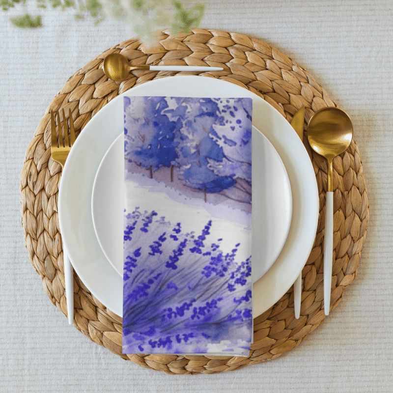Bring the serene beauty of lavender fields to your dining table with our exquisite set of 4 cloth napkins. Each napkin features a unique watercolor design of blooming lavender fields, capturing the calming essence and vibrant colors of nature. Crafted from 100% polyester with a soft-to-the-touch broadcloth fabric, these napkins are both durable and comfortable. Measuring 20″ x 20″ and hemmed on all sides, they offer a polished and elegant look. The printed top showcases the beautiful watercolor artwork, while the non-printed white bottom adds a clean finish. Perfect for special occasions or everyday use, these machine-washable napkins combine practicality with artistic charm. Elevate your dining experience with this stunning set, perfect for adding a touch of tranquility to any meal.