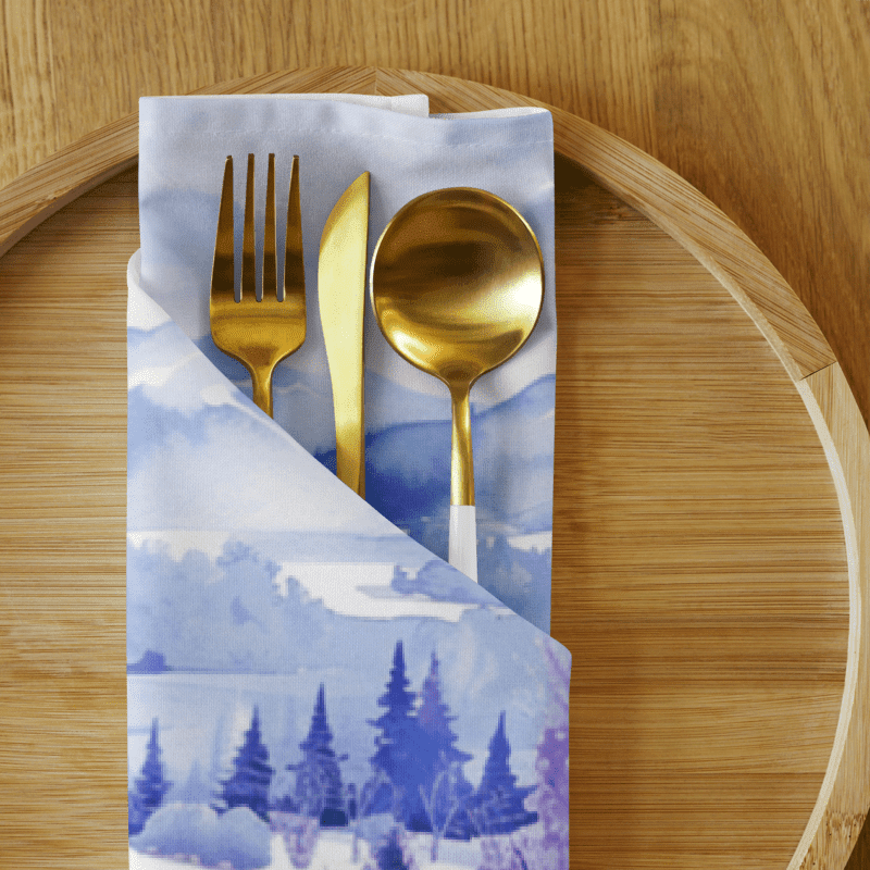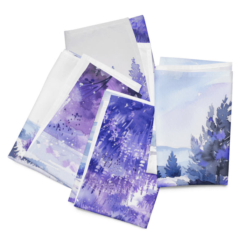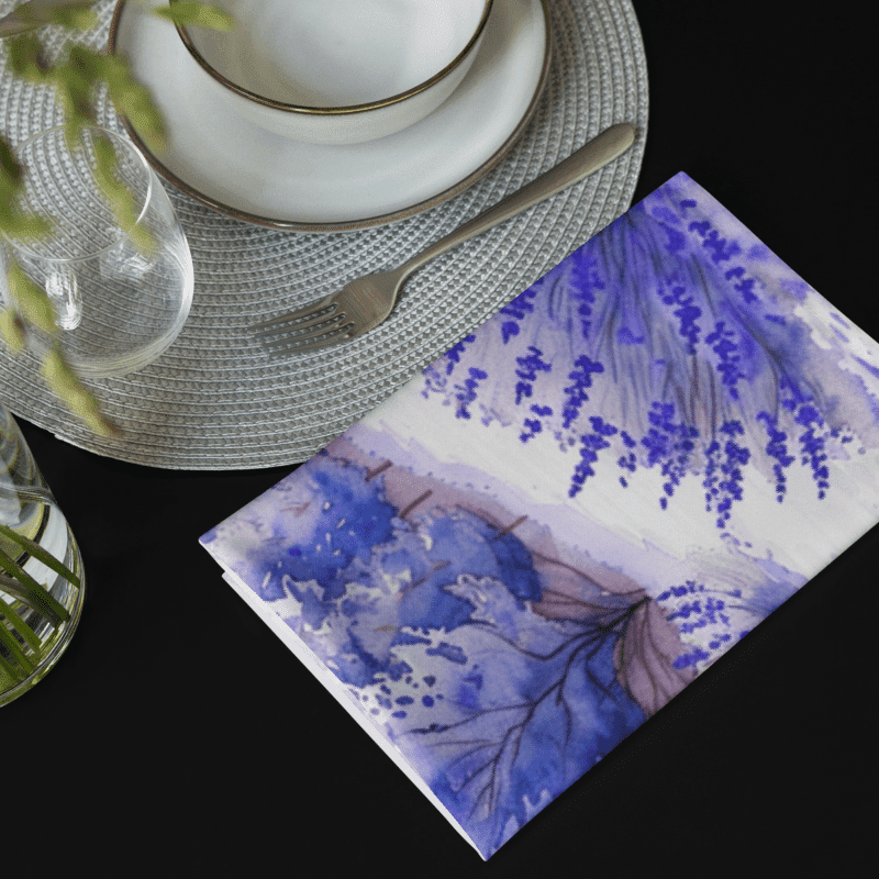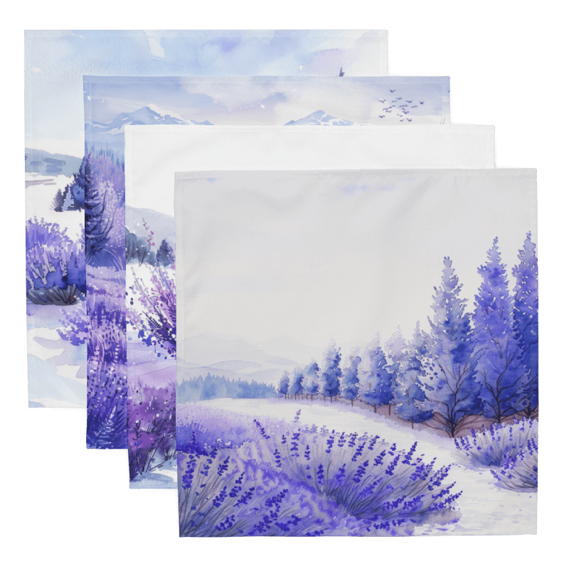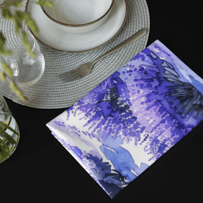 Bring the serene beauty of lavender fields to your dining table with our exquisite set of 4 cloth napkins. Each napkin features a unique watercolor design of blooming lavender fields, capturing the calming essence and vibrant colors of nature. Crafted from 100% polyester with a soft-to-the-touch broadcloth fabric, these napkins are both durable and comfortable. Measuring 20″ x 20″ and hemmed on all sides, they offer a polished and elegant look. The printed top showcases the beautiful watercolor artwork, while the non-printed white bottom adds a clean finish. Perfect for special occasions or everyday use, these machine-washable napkins combine practicality with artistic charm. Elevate your dining experience with this stunning set, perfect for adding a touch of tranquility to any meal.