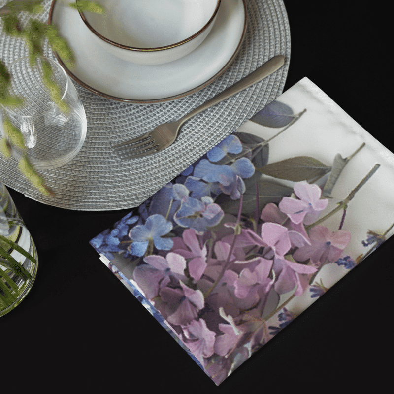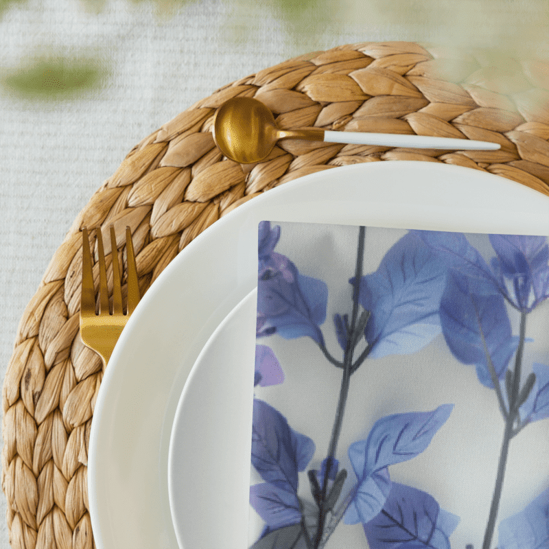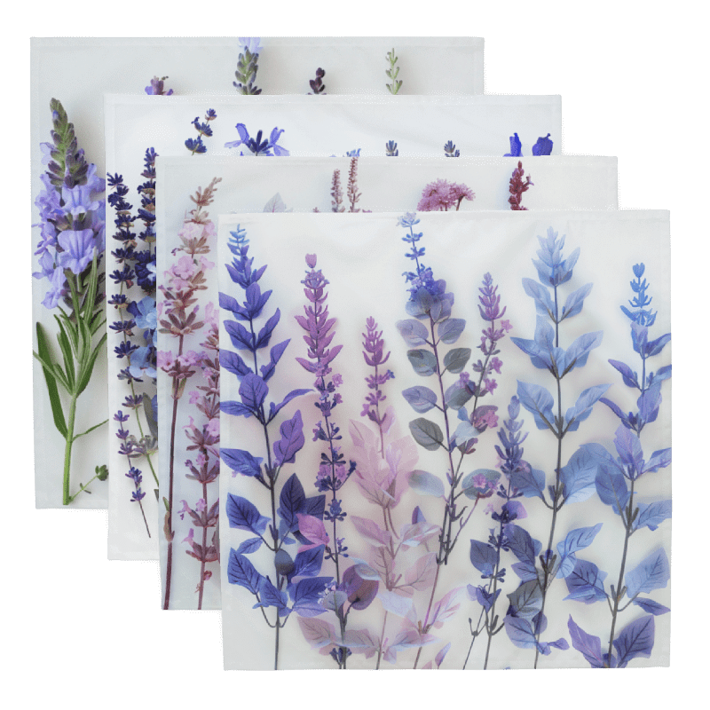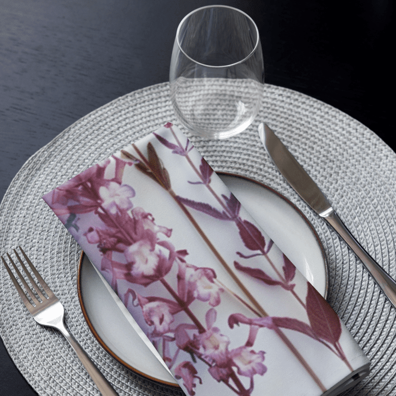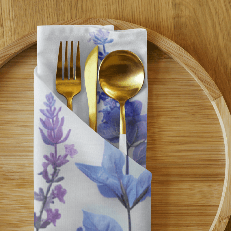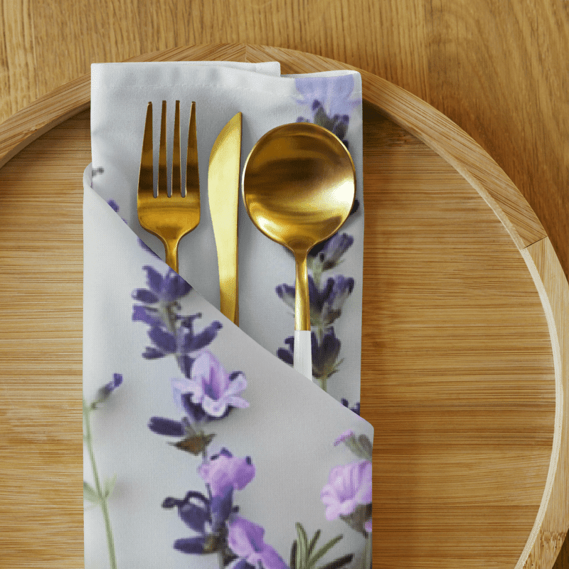 Enhance your dining experience with our elegant set of 4 cloth napkins, each featuring unique designs of lavender stems and flowers in various shades. These napkins capture the timeless beauty and soothing hues of lavender, adding a touch of natural charm to any meal. Crafted from 100% polyester with a soft-to-the-touch broadcloth fabric, they are designed for both durability and comfort. Each napkin measures 20″ x 20″ and is hemmed on all sides for a polished finish. The printed top highlights the delicate lavender designs, while the non-printed white bottom offers a clean, refined look. Perfect for special occasions or everyday use, these machine-washable napkins combine practicality with artistic elegance. Bring the serene beauty of lavender to your table with this stunning set.